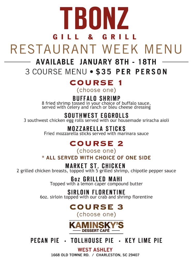 Gluten Free option available - These items can be altered to be gluten friendly TBonz is not a gluten free environment. Our menu items are handcrafted in our kitchens, oftentimes using shared equipment (including common fryers) and variations in vendor-supplied ingredients may occur. For these reasons, we cannot assure you that any menu item will be entirely gluten free. <br>